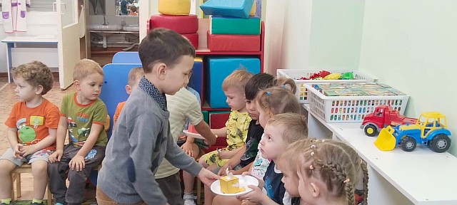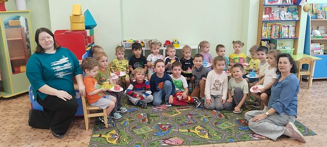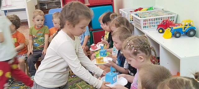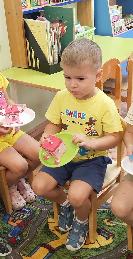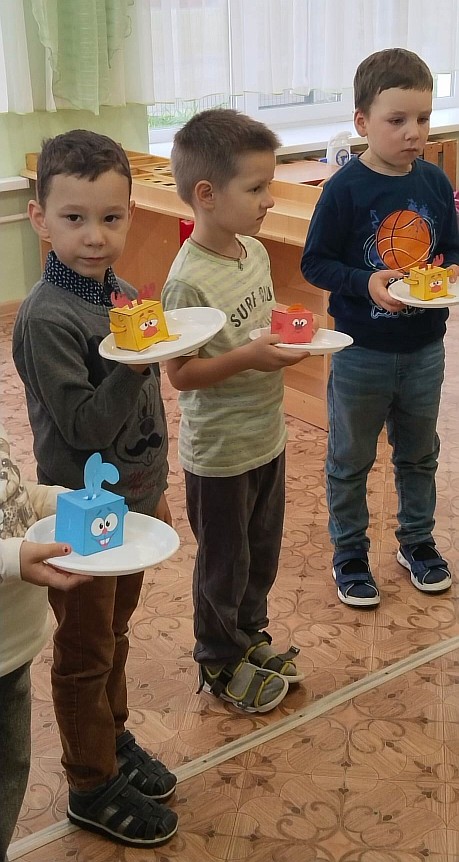 Ребята из группы «Солнышко» нанесли визит малышам группы «Акварелька». И пришли они не с пустыми руками. Каждому малышу был вручен подарок, изготовленный собственными руками – герои мультфильма про Смешариков: добрый и хозяйственный Копатыч, свинка-модница Нюша, веселый и энергичный кролик Крош, интеллигентный ученый лось Лосяш.